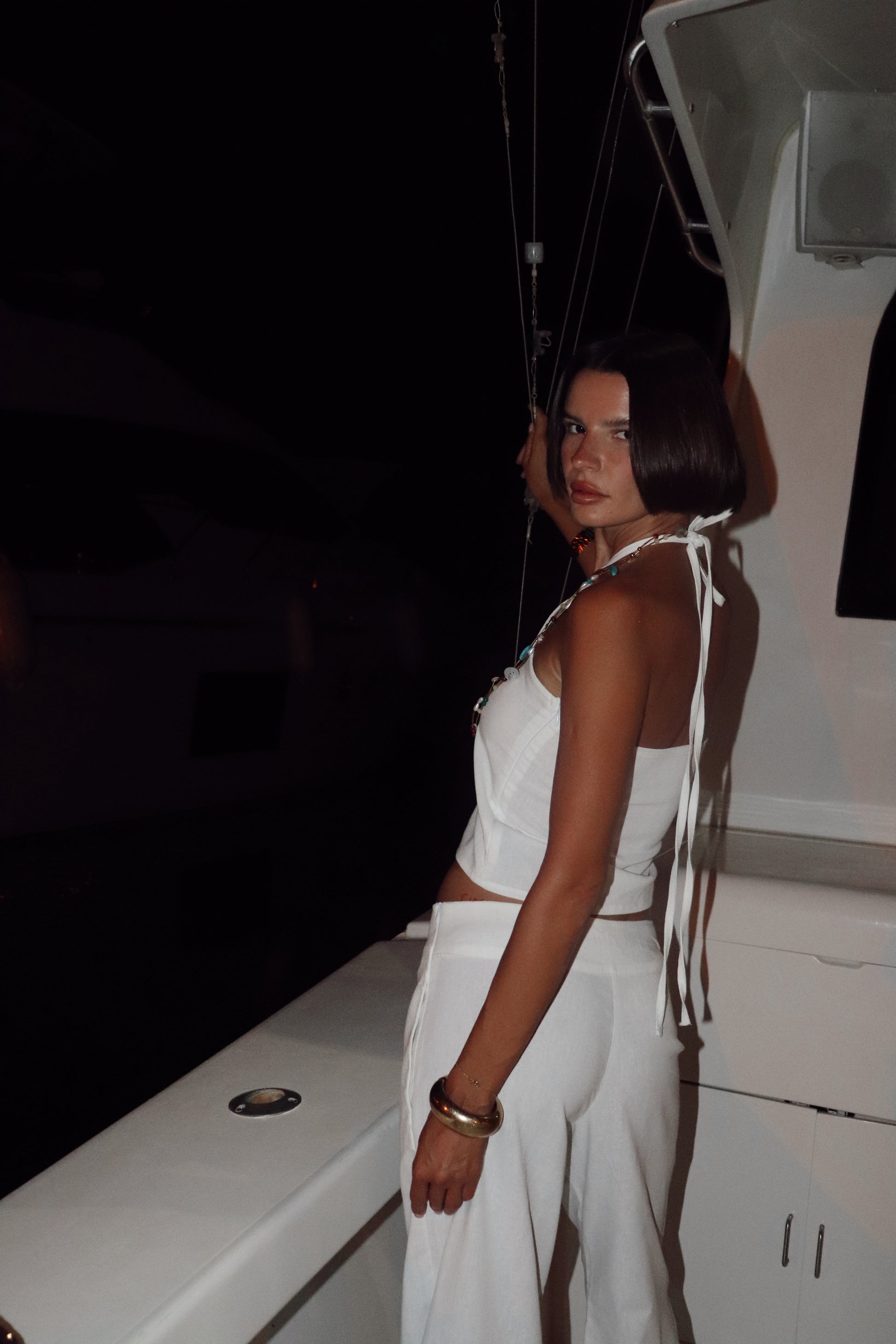 Slip into the soft rhythm of the sea with the Tidal Set. Crafted from airy linen, this two-piece look is equal parts effortless and refined. The halter top paired with a low waisted pants cinch gracefully with a detachable belt, offering a relaxed silhouette that moves with you—from sunrise strolls to golden hour lounging.